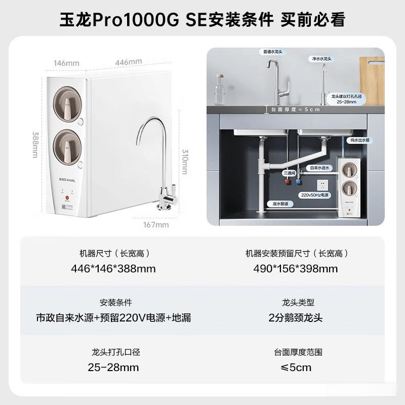 1、超级耐用:这款净水器采用的是安吉尔核芯科技RO膜,10页卷制达到显微镜级可视精度,不仅过滤效果出众,还能满足一家五口的日用需求,耐用5年。日均用水23升,每升水不到2分钱,省钱又省心。